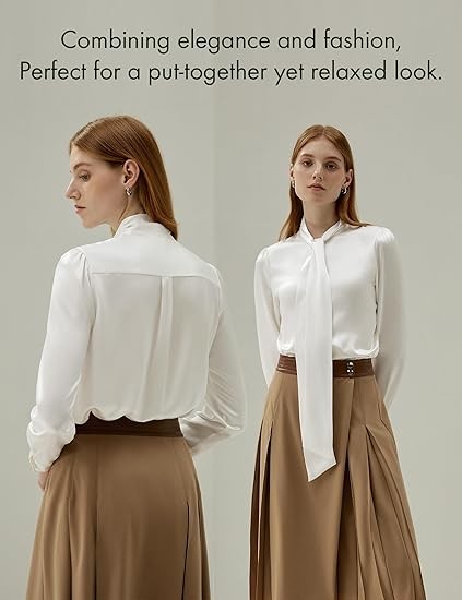 ELEGANT, TIE COLLAR, BUTTON FRONT: A silk blouse that makes you look stunning, with the great sheen of silk and second-to-none silhouette. It's no doubt that your skin will be perfectly glowing the moment you put it on. Exaggerated bow tie neckline draws people's attention to your beautiful face and neck. Plus, you can just let loose the necktie, to keep the breeze at bay.