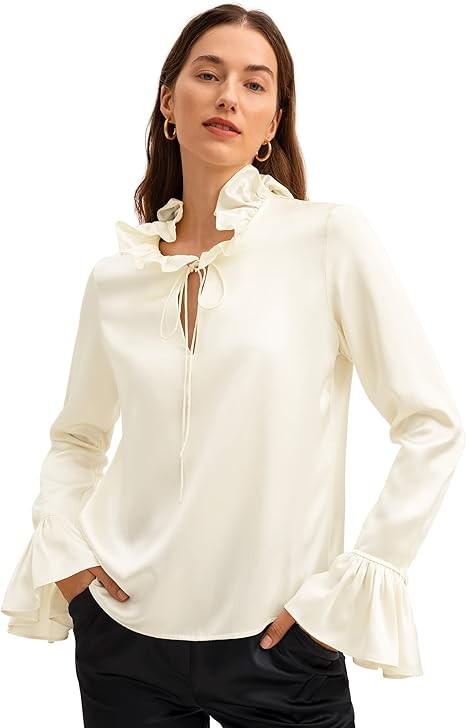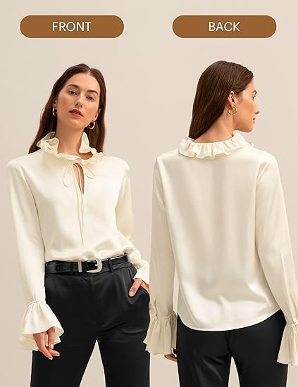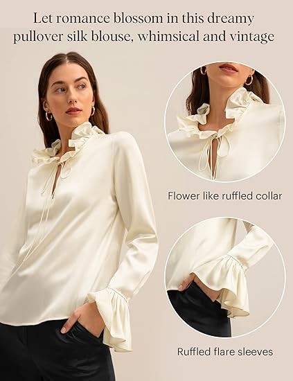 SPECIAL DESIGN FOR FEMININE LOOK: Let romance blossom in this dreamy pullover silk blouse featuring petal-like ruffles along the neckline and cuffs for a whimsical and vintage appeal. Crafted from 22 momme charmeuse silk for luxe softness and sheen, you'll also adore the versatility of the tie collar which can be worn tied in a feminine bow at the neck or open for an effortlessly undone look.