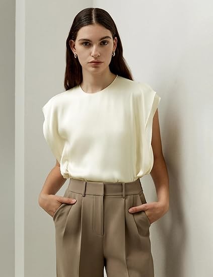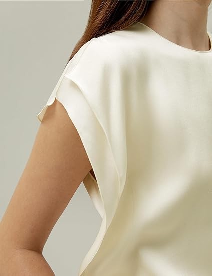 CLASSIC and ELEGANT: Featuring exquisite double-layered flutter sleeves, this top brings a touch of airy elegance to your ensemble. Made from the finest Double-Faced Silk Charmeuse, it offers unparalleled softness and breathability, ensuring comfort and luxury in every wear. The sleek, invisible zipper provides a clean, uninterrupted silhouette, while the tailored fit beautifully accentuates your figure.