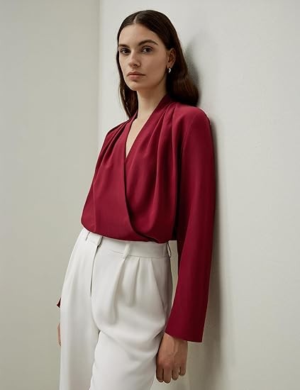 This women's blouse from LilySilk, made from 100% premium Mulberry Silk, exudes a luxurious, soft, and elegant feel. The overlapping V-neck design, combined with neat symmetrical pleats, creates a graceful yet professional silhouette—perfect for work wear.