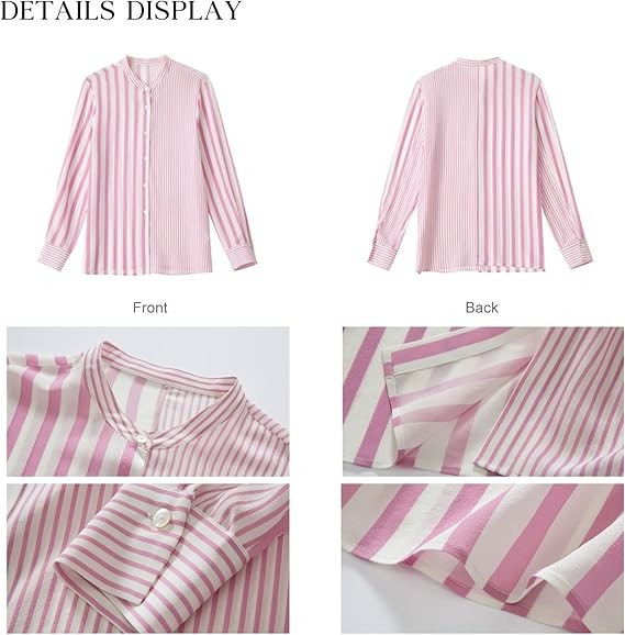 Fabric:This V-neck small stand collar and high-quality button design pink and white striped blouse is made of 6A Grade 100% pure mulberry silk,which feels smooth and luxurious against your skin and has a lustrous drape